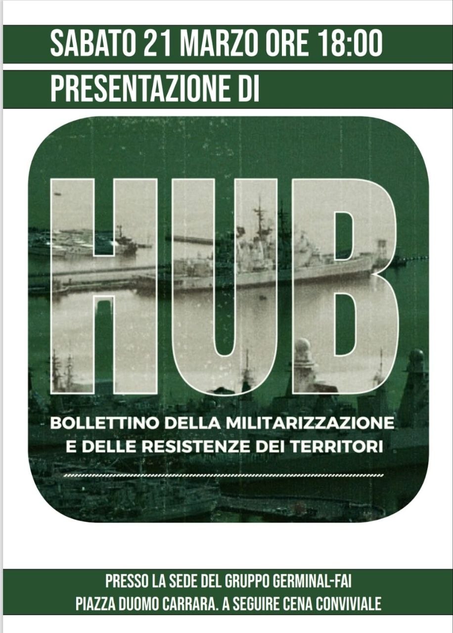 CARRARA: presentazione di HUB-bollettino della militarizzazione e resistenze dai territori