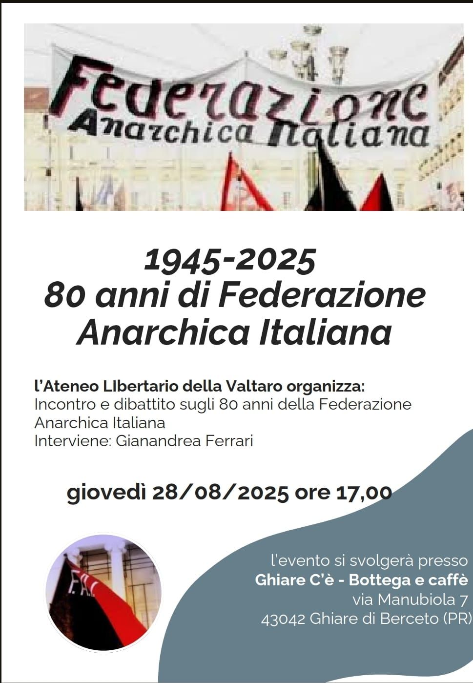 L’ateneo libertario della Valtaro organizza un incontro-dibattito sugli 80 anni della Federazione Anarchica Italiana. Interviene: Gianandrea Ferrari. L’evento si svolgerà il giovedì 28 Agosto 2025 alle 17.00 presso Ghiare C’è – Bottega e caffé – via Manubiola 7 43042 Ghiare di Berceto (PR)