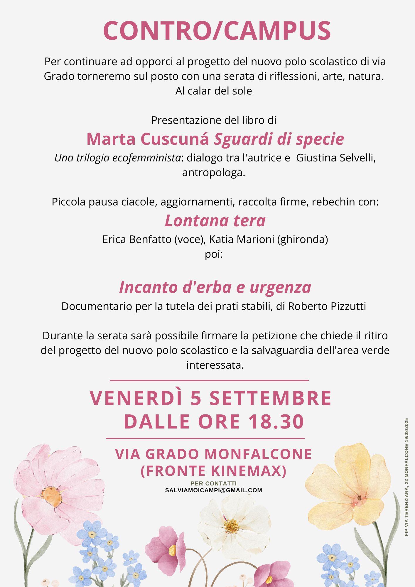 Per continuare ad opporci al progetto del nuovo polo scolastico di via Grado torneremo sul posto con una serata di riflessioni, arte, natura.