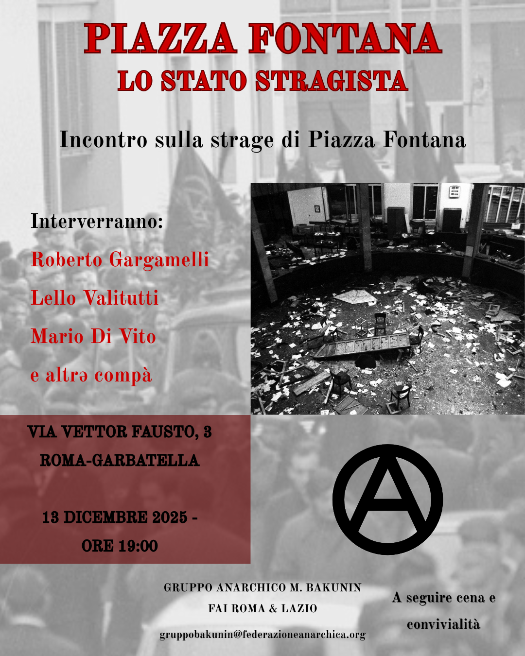 Nell’anniversario della strage di Piazza Fontana e dell’omicidio di Pino Pinelli vogliamo tornare a ragionare attorno ad una ferita collettiva che continua a interrogare il presente. Proponiamo un momento di confronto che parta dalle responsabilità politiche e dalle manipolazioni che segnarono l’avvio della strategia della tensione, fino ad arrivare a oggi, quando gli eredi degli stragisti siedono sulle stesse poltrone di chi organizzò, eseguì e coprì quelle stragi.