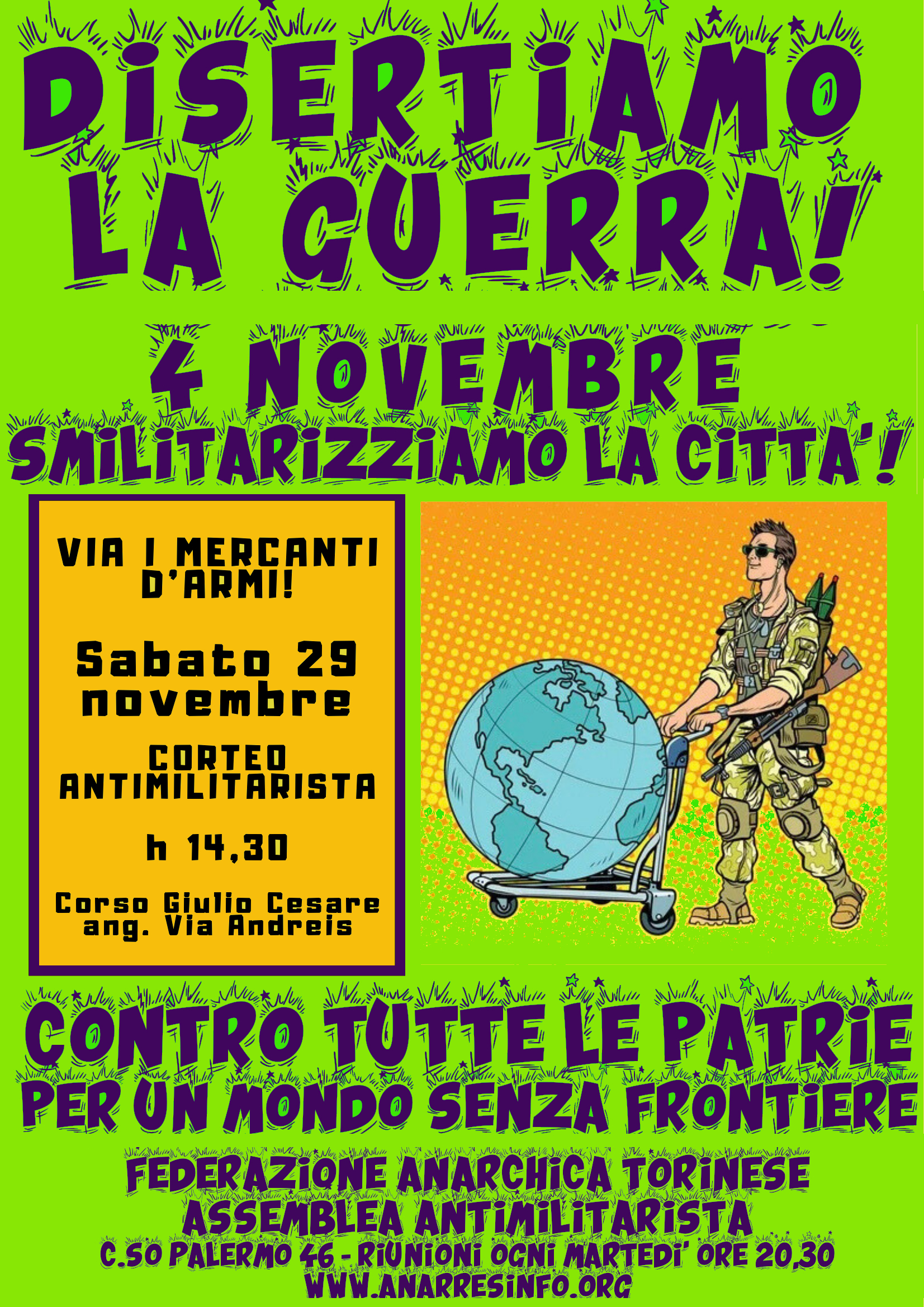 Smilitarizziamo la città! Il 4 novembre, nell’anniversario della “vittoria” nella prima guerra mondiale, in Italia si festeggiano le forze armate, si festeggia un immane massacro per spostare un confine. In quella guerra a migliaia scelsero di gettare le armi e finirono davanti ai plotoni di esecuzione. La memoria dei disertori e dei senzapatria di allora vive nella solidarietà concreta con…