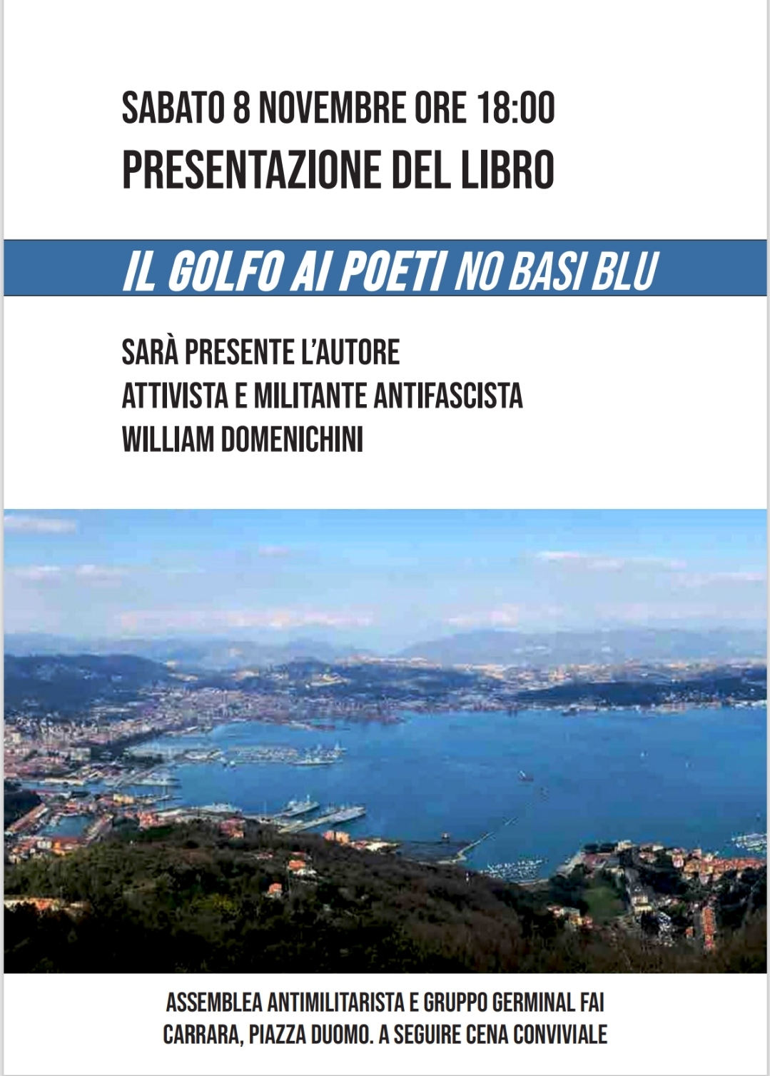Sabato otto novembre, presso la sede del gruppo Germinal FAI in piazza Duomo Carrara, presentazione del libro Basi Blu. Ne parleremo con William Domenichini autore, attivista nel Comitato Murati Vivi di Marola piccolo borgo della città ligure circondato e impossibilitato all accesso al mare perché di pertinenza della Marina militare. La vocazione che lo Stato italiano ha relegato alla città… |