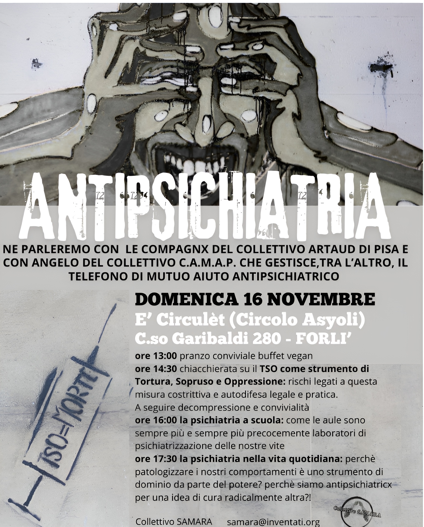 FORLÌ - DOMENICA 16 NOVEMBRE presso E' Circulet (Circolo Asyoli), corso Garibaldi 280. ➡️ GIORNATA DI APPROFONDIMENTO E DISCUSSIONE SULL'ANTIPSICHIATRIA: ne parleremo con le/i compagnə del Collettivo Artaud di Pisa e con Angelo del Collettivo CAMAP che gestisce tra l'altro il telefono di mutuo aiuto antipsichiatrico. * Ore 13:00 pranzo conviviale con buffet vegan. * Ore 14:30 chiacchierata su il TSO come strumento di Tortura, Sopruso e Oppressione: rischi legati a questa misura costrittiva e autodifesa legale e pratica. * A seguire decompressione e convivialità. * Ore 16:00 la… |
