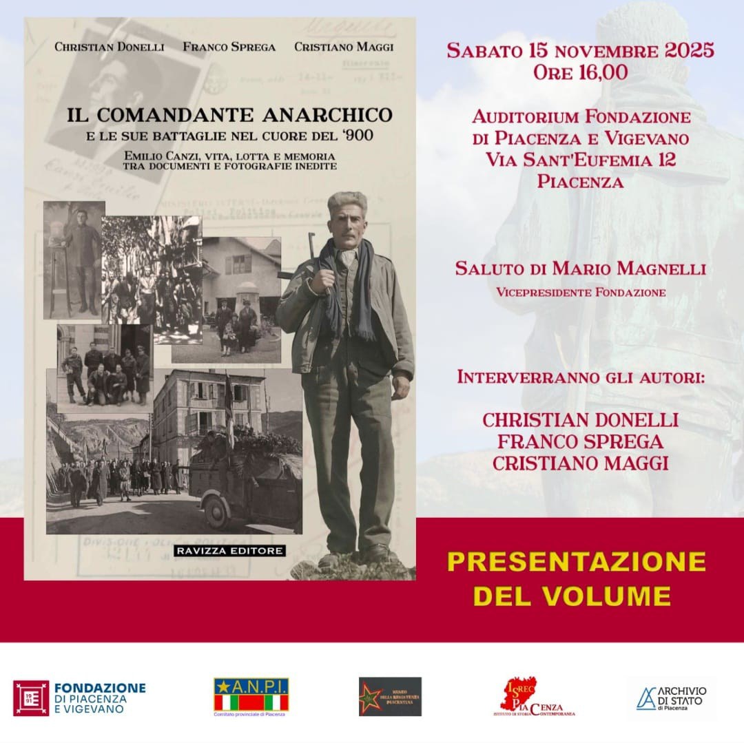Il Comandante anarchico, sabato 15 novembre a Piacenza la presentazione del libro sulla vita e le battaglie di Emilio Canzi Alle ore 16 all'Auditorium della Fondazione Piacenza e Vigevano. Edito da Ravizza Editore con documenti e fotografie inedite. La biografia del Comandante unico della XIII zona partigiana a ottant'anni dalla morte: dagli Arditi del Popolo all'attività antifascista clandestina in Francia,…