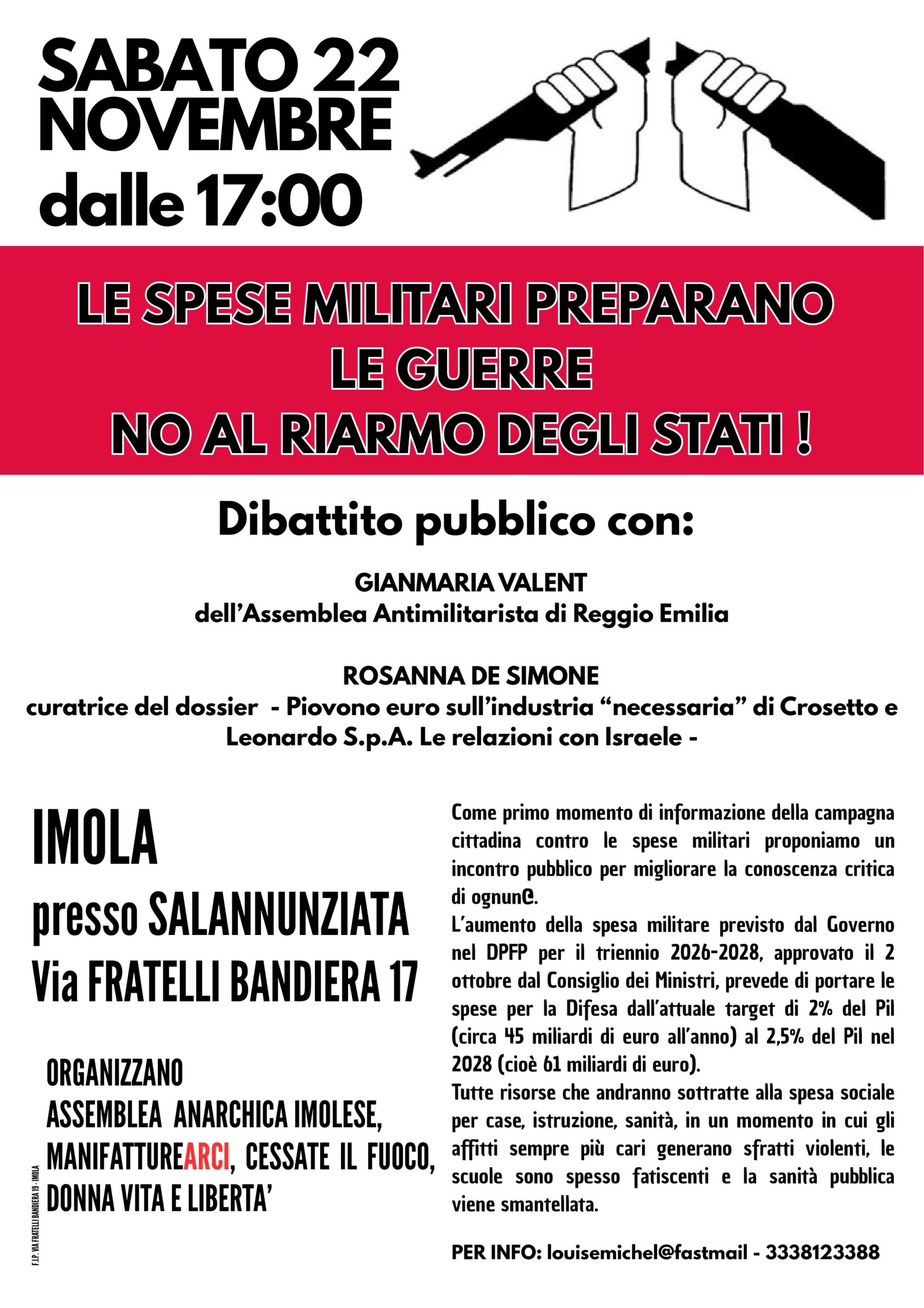 ➡️ GIOVEDÌ 20 NOVEMBRE. Approfondimento ed assemblea aperta sul traffico d'armi globale e gli snodi romagnoli coinvolti. * Ore 19.00 buffet vegan * Ore 20.00 avremo con noi Linda Maggiori (giornalista e attivista) che ci parlerà della filiera della produzione delle armi in Emilia-Romagna, con un occhio particolare al contesto forlivese, dove avanza il progetto della cittadella dell'aerospazio di Thales e Leonardo prevista nel quartiere Ronco. L'iniziativa… |