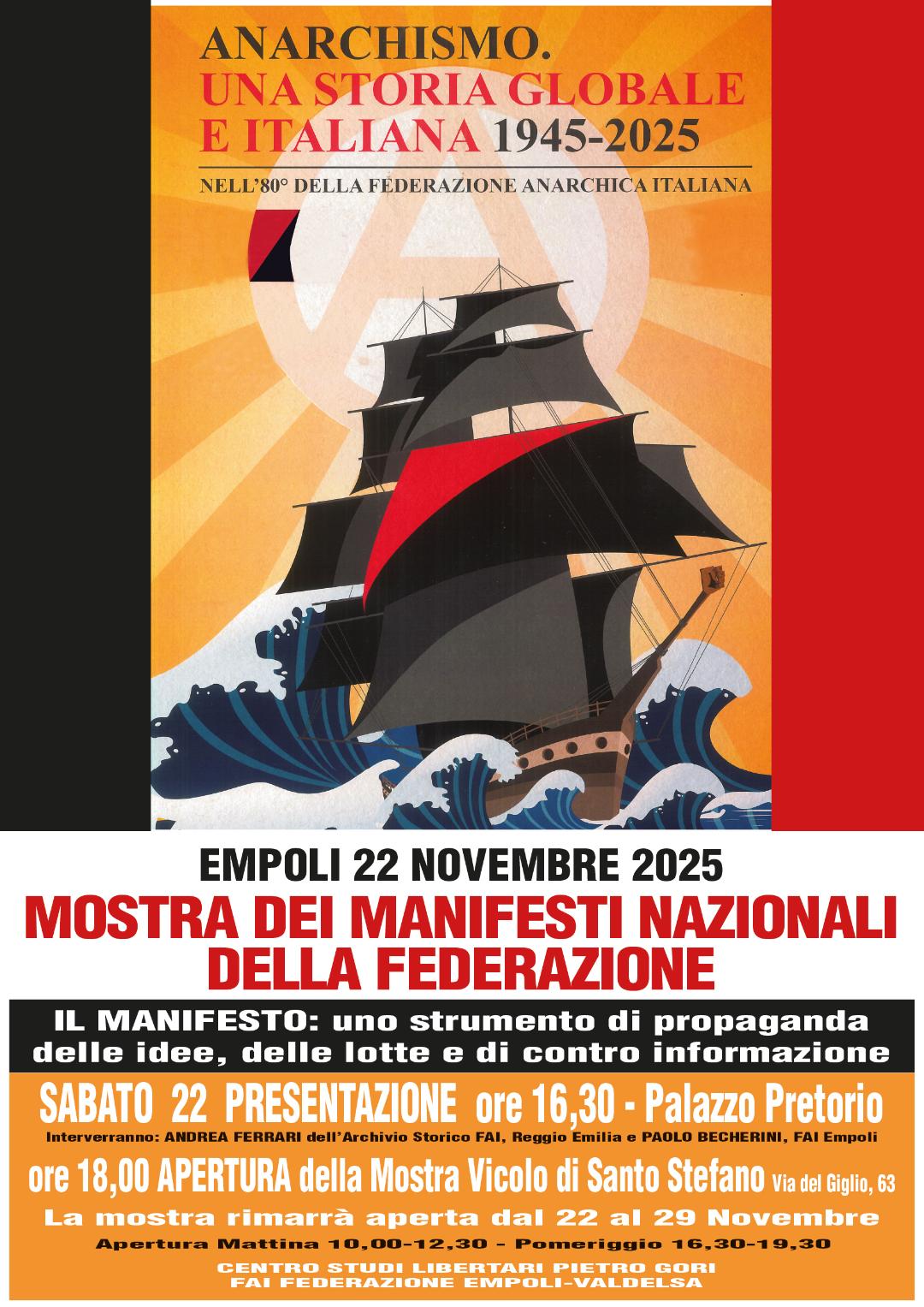 LA MOSTRA SI E’ FERMATA A EMPOLI Dopo l’inaugurazione della mostra dei manifesti della FAI, presentata a Carrara l’11 e il 12 ottobre nelle giornate studio di rilevanza internazionale, sul tema: Anarchismo. Una storia globale Italiana, per l’80° anniversario della Federazione Anarchica Italiana 1945 – 2025, la mostra si sta incamminando, navigando per tutta Italia. Chi non ha avuto la… |