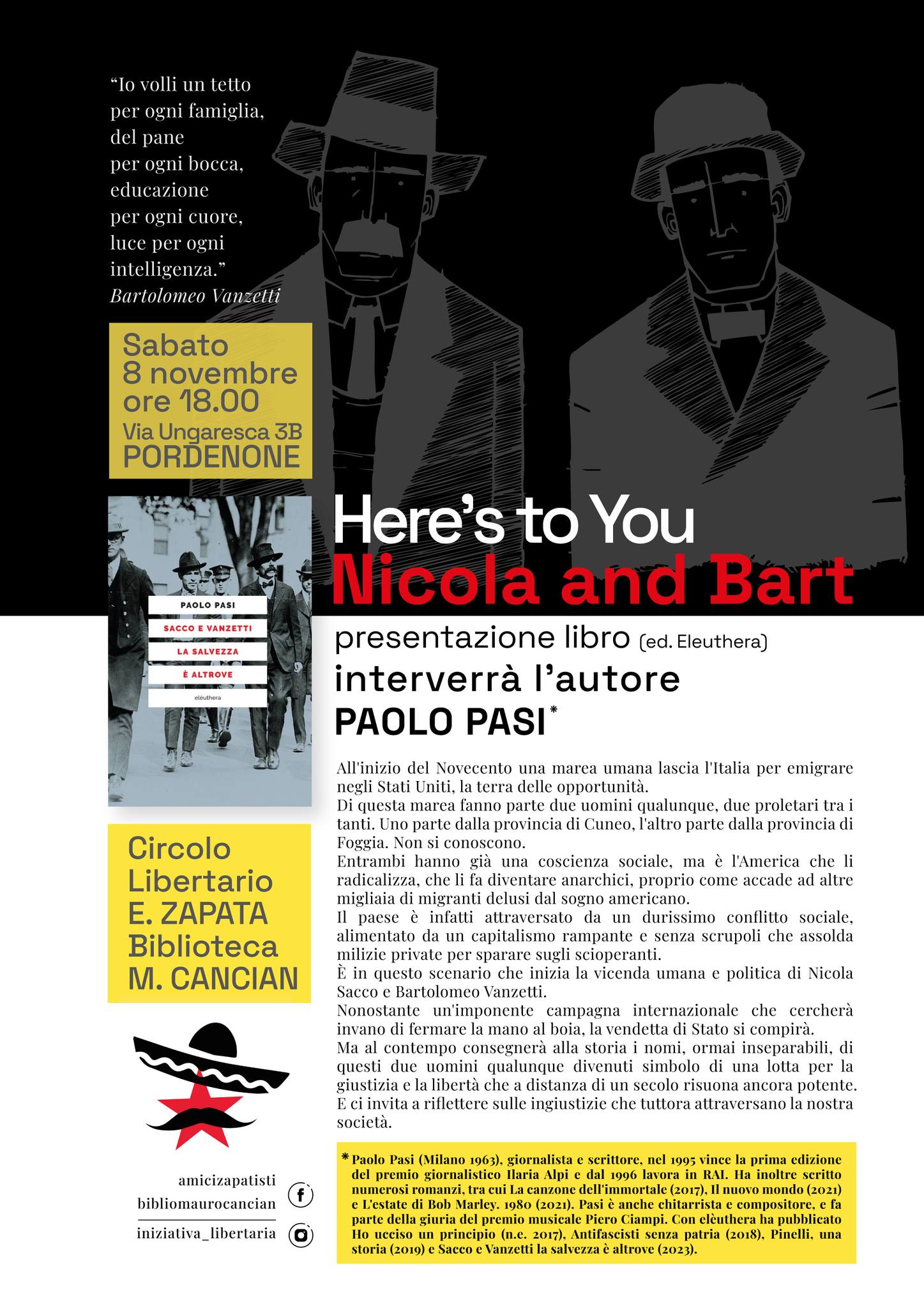 Sabato 8 novembre - ore 18.00 Presso la sede del Circolo Libertario “Emiliano Zapata" Via Ungaresca 3B - PORDENONE Presentazione libro SACCO E VANZETTI, LA SALVEZZA È ALTROVE (ed. Eleuthera) Here's to You Nicola and Bart interverrà l'autore PAOLO PASI* All'inizio del Novecento una marea umana lascia l'Italia per emigrare negli Stati Uniti, la terra delle opportunità. Di questa marea…