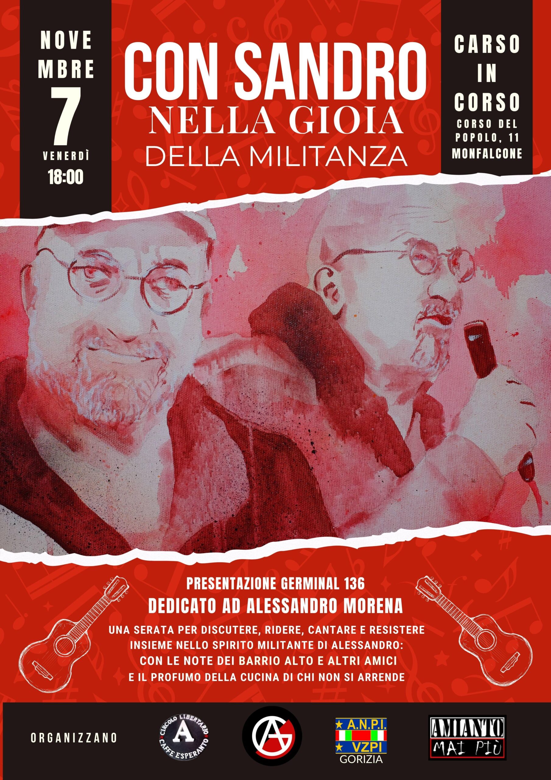 📅 Venerdì 7 novembre 2025 – ore 18.00 📍 Carso in Corso, Monfalcone (GO) Presentazione del nuovo numero del giornale anarchico e libertario Germinal n.136, novembre 2025, dedicato alla memoria di Alessandro Morena, figura di riferimento per il movimento libertario nel territorio di Monfalcone e regionale. La serata, ospitata negli spazi di Carso in Corso a Monfalcone, sarà un momento di… |